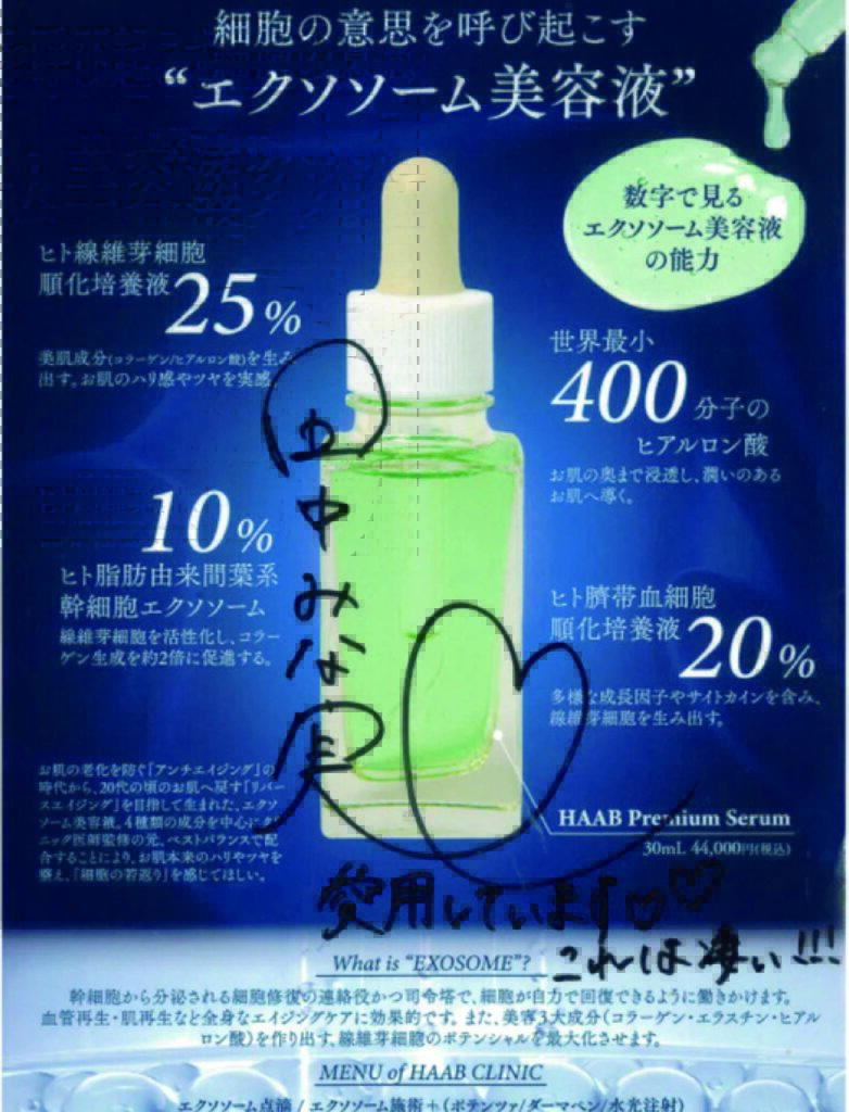 日本人女性の肌細胞に合わせた若返りの効果が実証されている日本人にあったエクソソームを当院では使用しております。